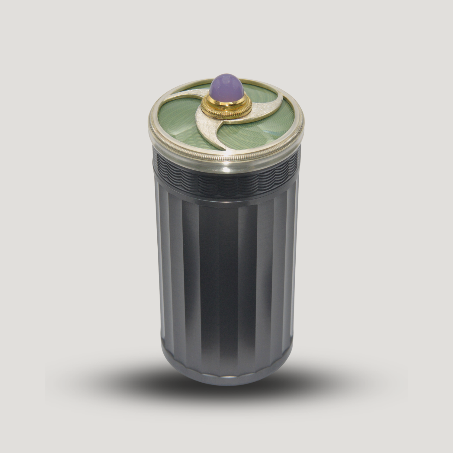 The cap of this exquisite vessel features a fine silver disc, engine-turned with a spiral pattern and covered with a sage/olive coating of genuine vitreous enamel. The Sterling Silver case enclosing the disc is entirely handmade, pierced with a matching spiral motif and topped with a Holly Blue Chalcedony weighing 2.63 carats and set in an 18K gold bezel.