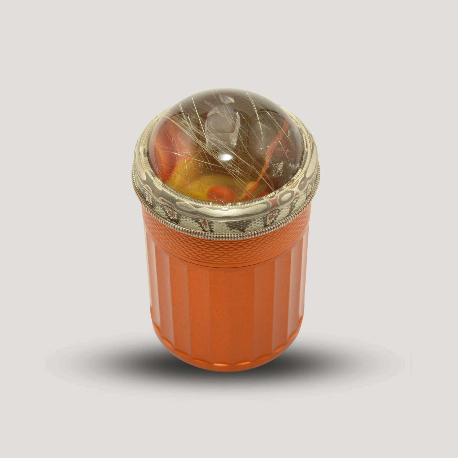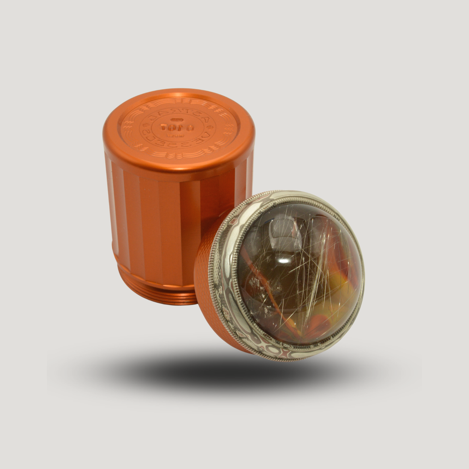 This special Vessel features a truly artisanal gemstone created by our longtime partners at the Wackler Gem Company. It is a Doublet consisting of a hemispherical Rutilated Quartz cabochon bonded to a lower flat layer of Condor Agate from the Patagonia region of Argentina.