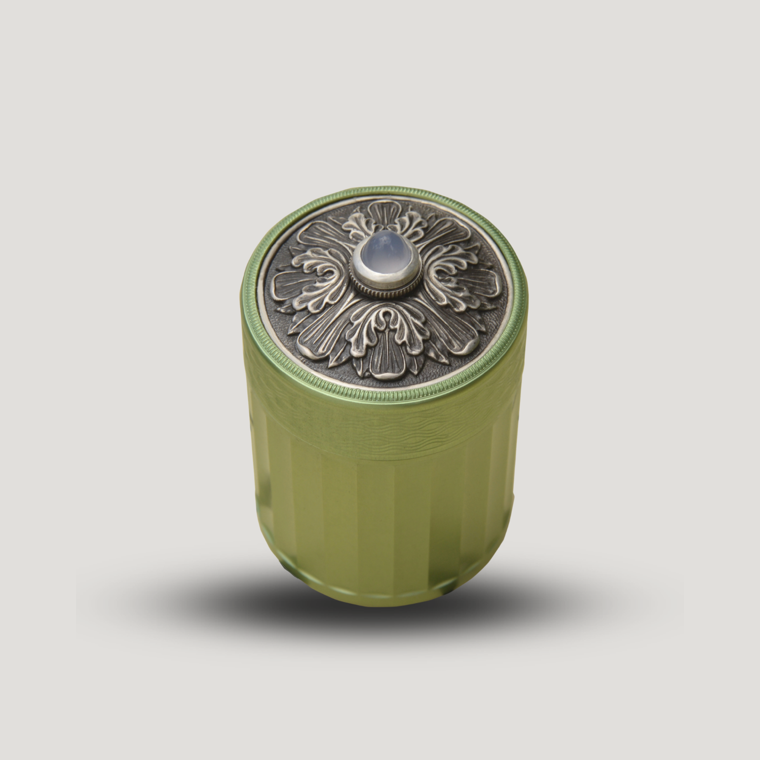 This beautiful vessel bears a classical Sterling Silver acanthus leaf medallion inset into its cap. Designed and carved in relief by master engraver Amayak Stepanyan, its low dome is crowned with a 6mm diameter natural Blue Chalcedony gemstone weighing 1.16 carats and set in a Sterling Silver bezel.