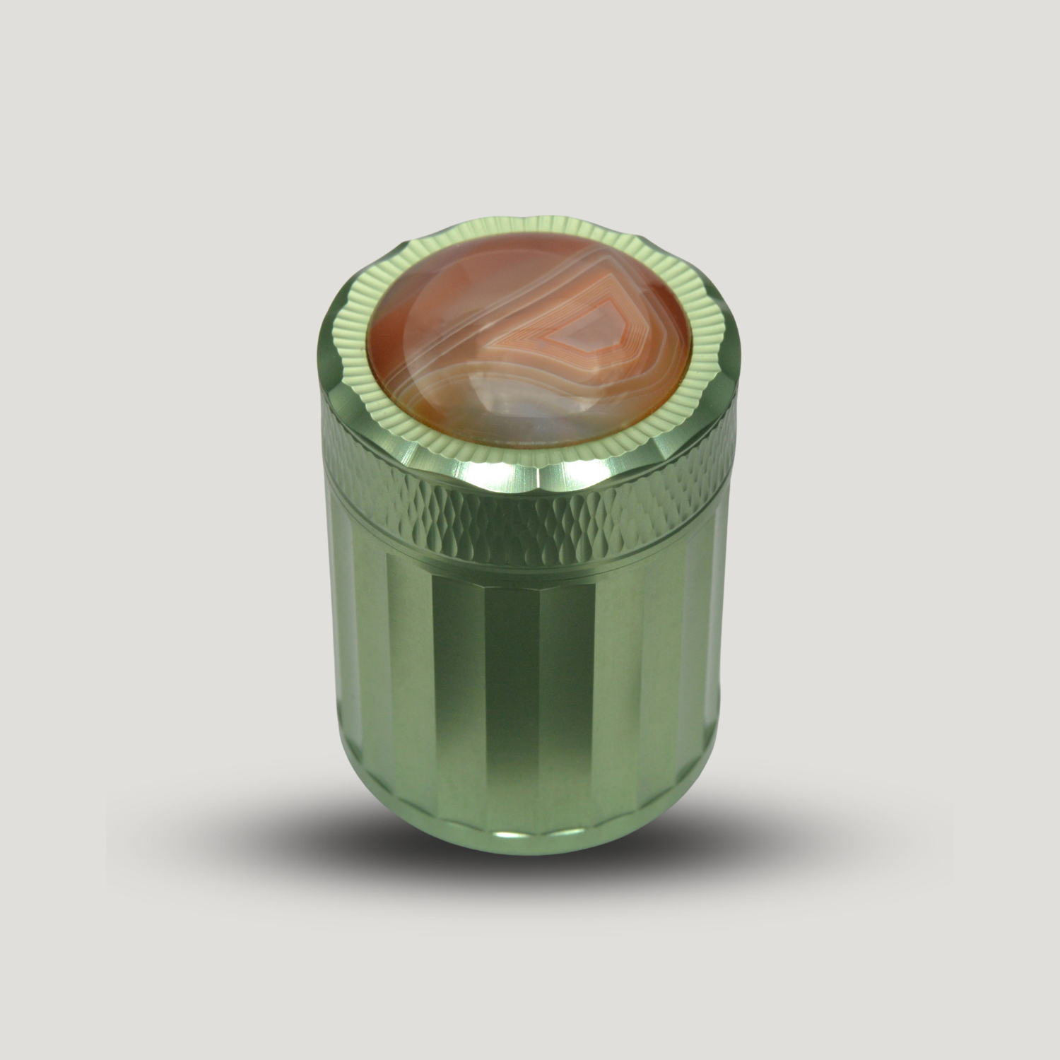 This vessel features a Rose Engine carved and engraved cap that compliments the classical 24-flute pattern carved onto the body with our ornamental lathe. The inset gemstone is a natural orange banded agate from Botswana.