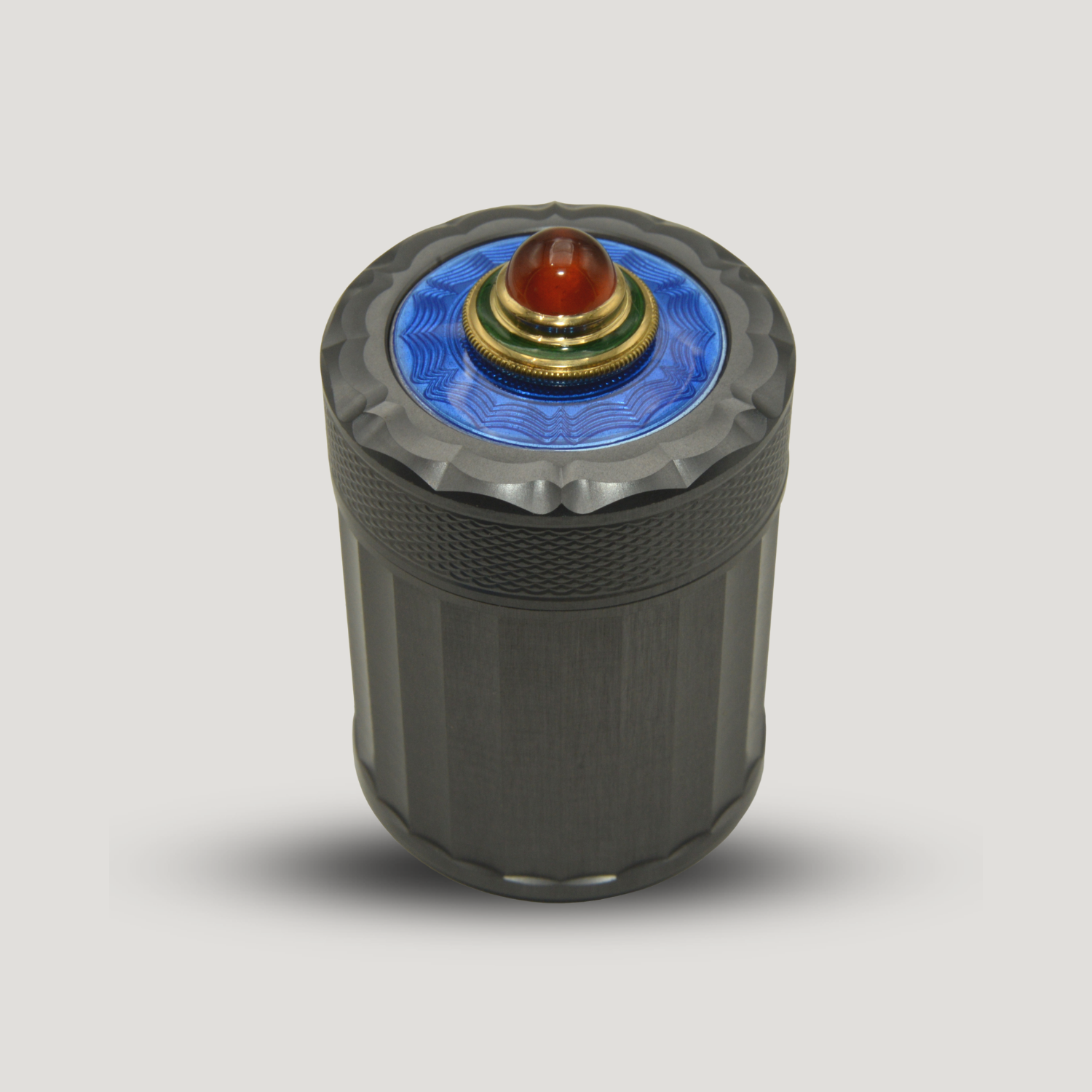 This spectacular Vessel features an African Spessartite Garnet set in an 18k Gold bezel with a stripe of green champleve Enamel. It’s perched on top of a cobalt blue guilloche Enamel disc engraved with the inverse of the waveform we carved into the top edge of the cap with our 1915 Rose Engine. The classic and complimentary fluting pattern on the body below was cut using our 1875 Ornamental Lathe.