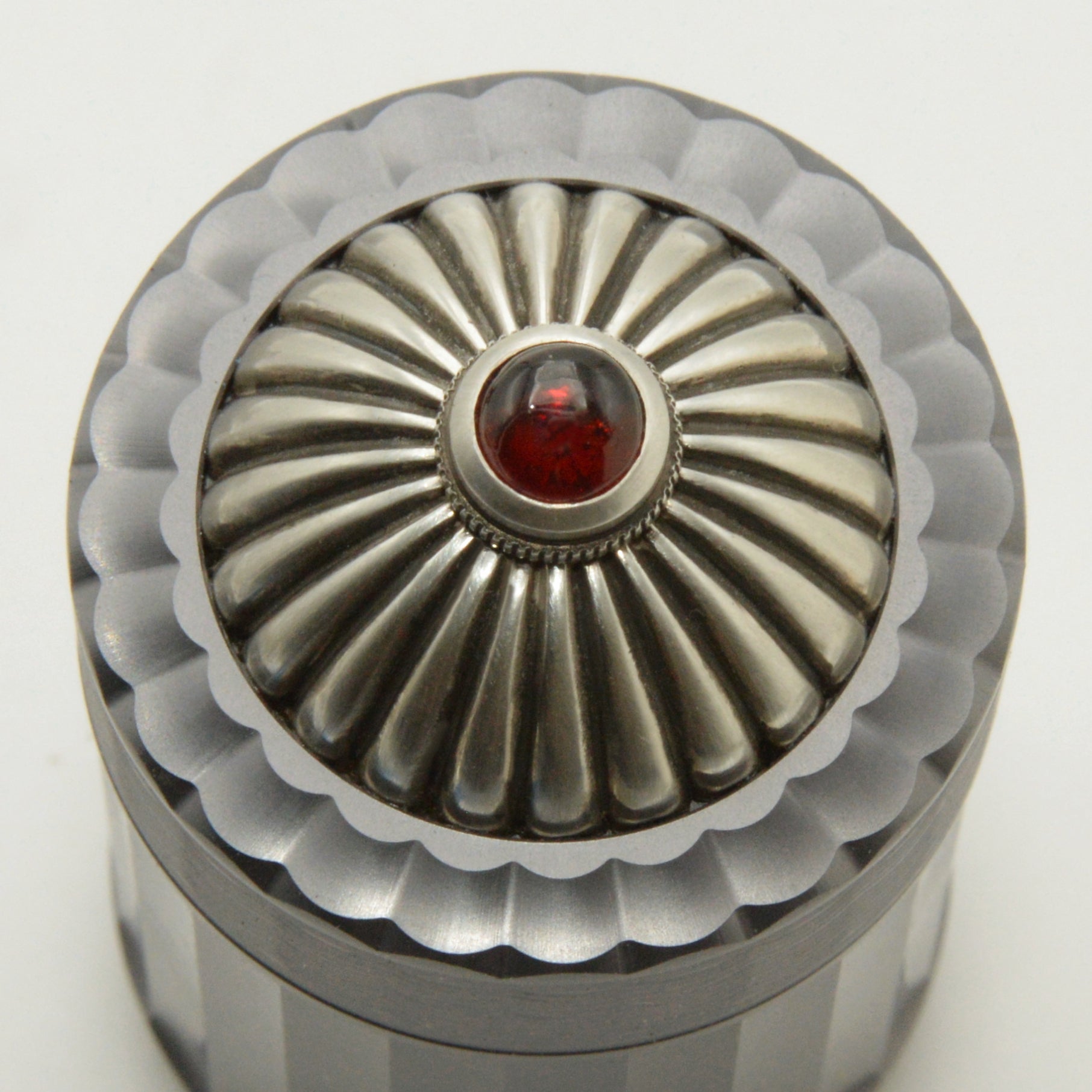 The cap of this Gunmetal Gray vessel has been Rose Engine carved and engraved on the top and sides, each with a pattern of 24 divisions that aligns with the solid Sterling Silver fluted dome inset into the top. The original model for this sparkling medallion was also created on an ornamental lathe, using a rare Spherical Sliderest.