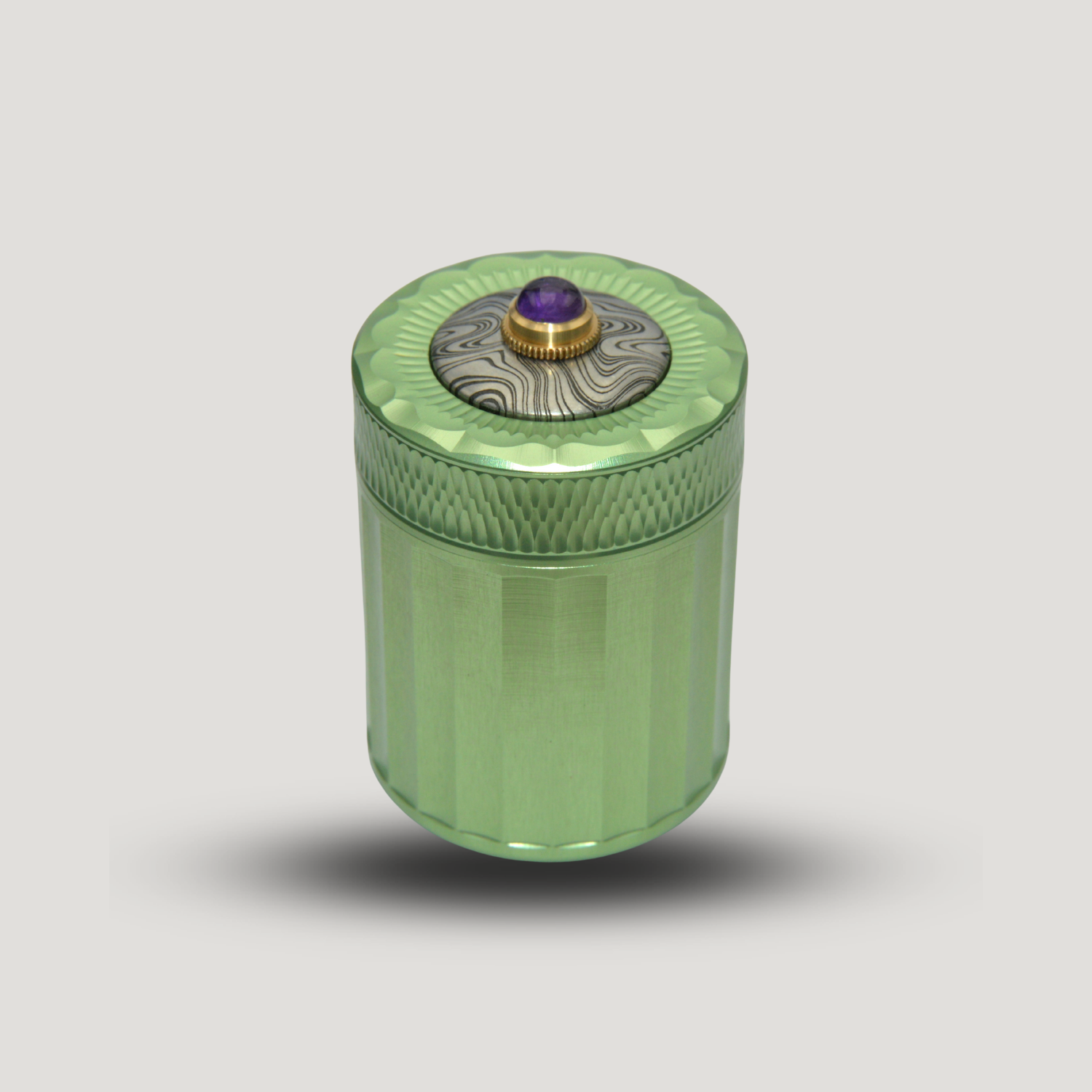 This special vessel features a Rose Engine carved cap with an ornamental grip on the sidewalls. We inlaid a stunning Stainless Damascus Steel medallion into the top surface and crowned it all with a natural Amethyst gemstone set in an 18K gold bezel of our signature design.